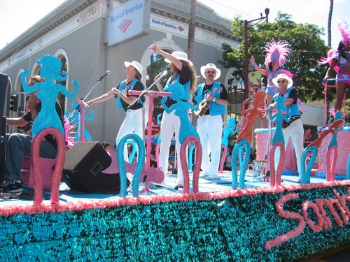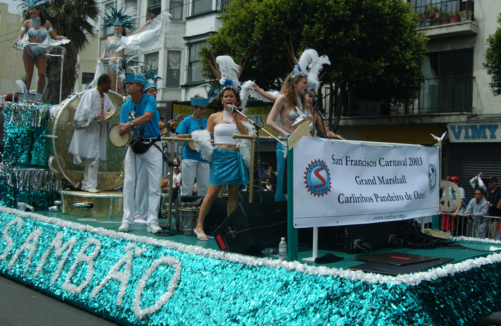 Enredo by Brad Hamilton Colors = Teal and White T-Shirt = Teal/Blue Artwork by Nicole Marinkovich Float = Two giant Golden Pandeiros |